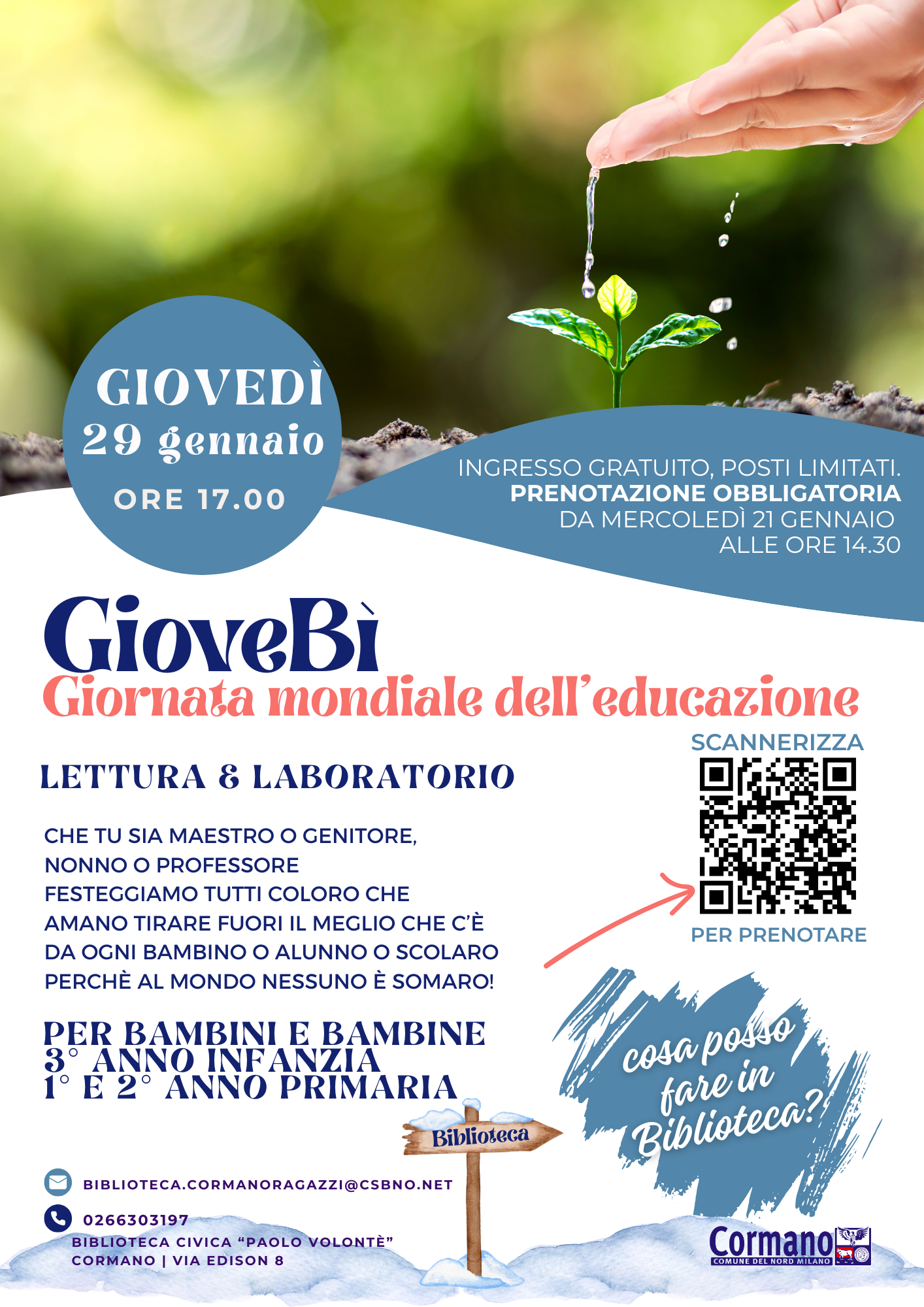 Si aprono mercoledì 21 alle 14.30 le iscrizioni per l'ultimo GioveBì di gennaio per bambine e bambini 3° Infanzia e 1° e 2° Primaria accompagnati da un adulto..
