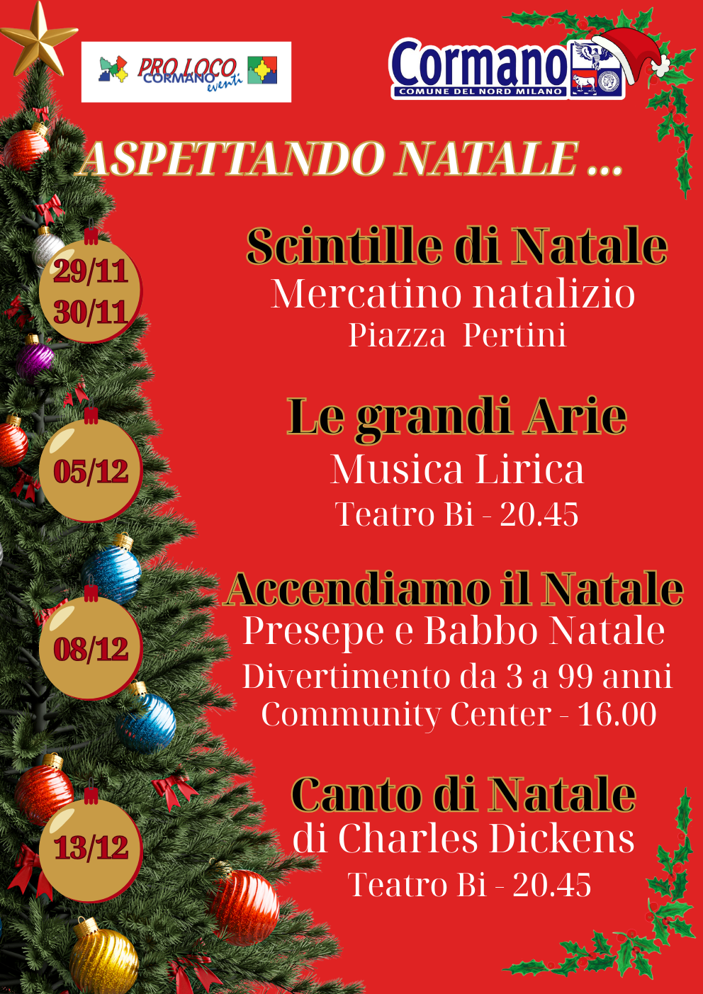 L’atmosfera natalizia si accenderà, infatti, venerdì 29 e sabato 30 novembre in Piazza Pertini, dove sarà possibile visitare il mercatino natalizio sempre meravigliosamente organizzato da Pro Loco Cormano, con stand delle associazioni del territorio e degli hobbisti locali: un’occasione perfetta per fare acquisti che fanno bene al portafoglio – grazie all’ottimo rapporto qualità-prezzo – e al cuore, perché il ricavato sostiene progetti sociali e solidali della nostra comunità. Nella giornata di domenica si aggiungeranno bancarelli più tradizionali lungo via papa Giovanni XXIII.
