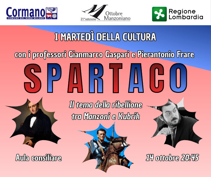 “Spartaco: il tema della ribellione tra Manzoni e Kubrick” è il titolo dell’incontro che vedrà protagonisti i professori GianMarco Gaspari (Università dell’Insubria) e Pierantonio Frare (Università Cattolica di Milano). Un dialogo tra letteratura e cinema, tra storia e attualità, per riflettere sul concetto di ribellione.