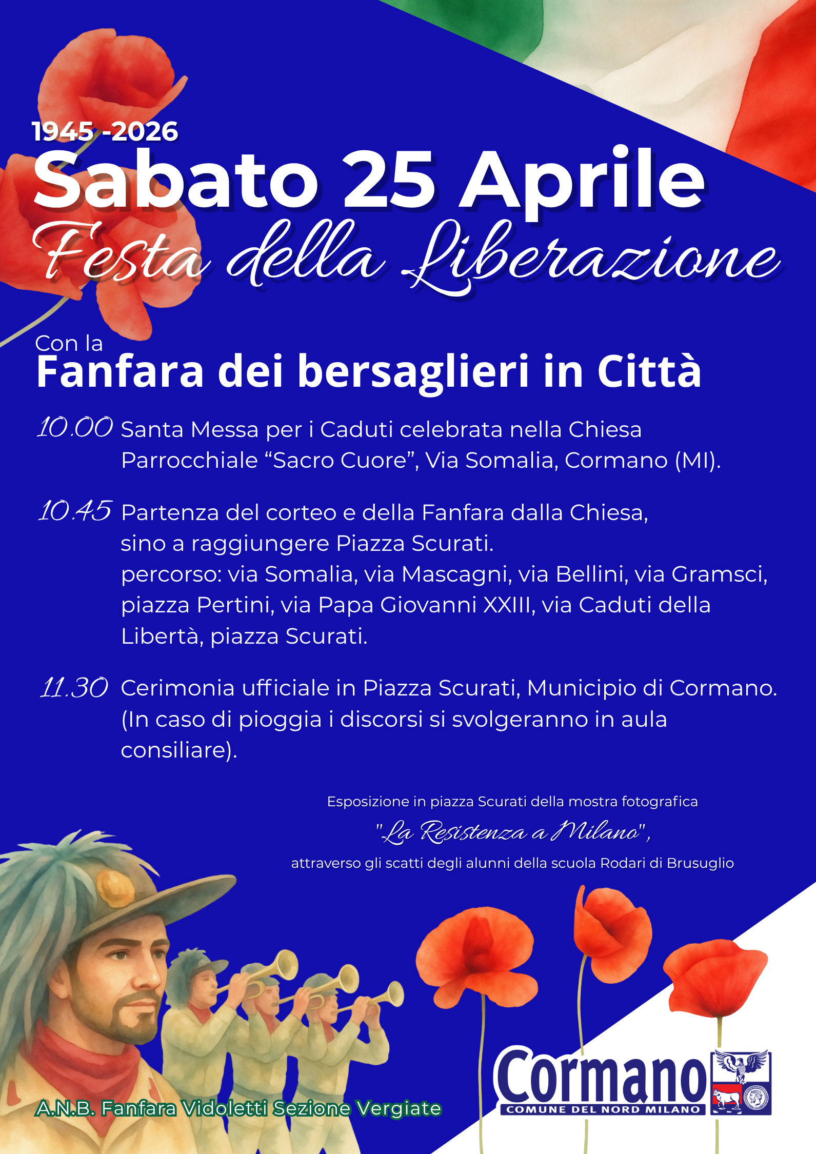 Le celebrazioni della Festa della Liberazione si svolgeranno sabato 25 aprile a partire dalle ore 10.00 e Cormano ospiterà anche la Fanfara dei Bersaglieri, la quale percorrerà le vie della città.
