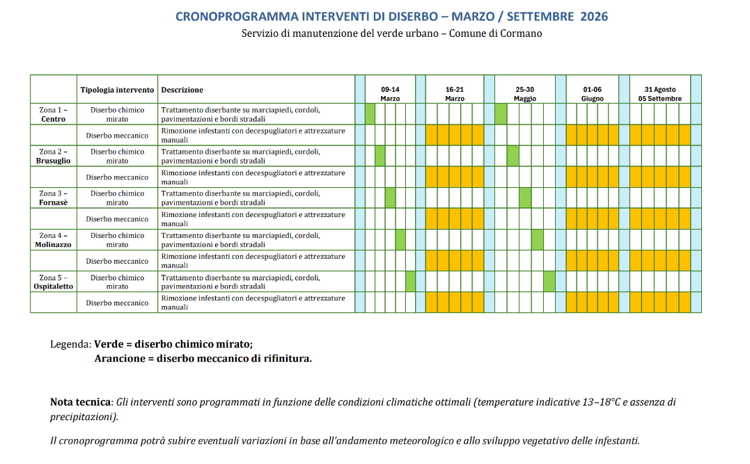 Di seguito si condivide il cronoprogramma operativo degli interventi di diserbo programmati sul territorio comunale, redatto in coerenza con quanto previsto dal Piano del Diserbo e Gestione Integrata della Vegetazione Spontanea adottato dal Comune di Cormano e nel rispetto delle disposizioni normative previste dal Piano di Azione Nazionale (PAN) per l’uso sostenibile dei prodotti fitosanitari.
