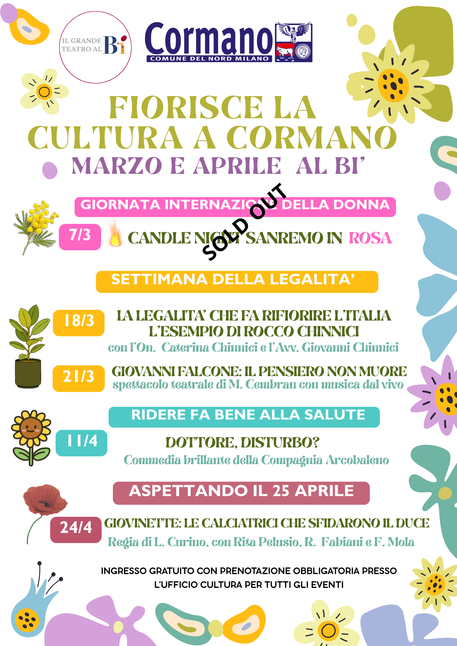 L’Amministrazione comunale presenta la rassegna “La cultura fiorisce a Cormano”, il calendario di iniziative che nei mesi di marzo e aprile 2026 animerà il Teatro Bì con appuntamenti dedicati alla valorizzazione della memoria civile, della cultura e della partecipazione collettiva. Dopo il successo del primo evento, Candle Night – Sanremo in rosa, già sold out e riservato ai partecipanti agli incontri della Memoria, la programmazione entra ora nel vivo con un ricco percorso di approfondimenti, spettacoli e momenti di comunità.