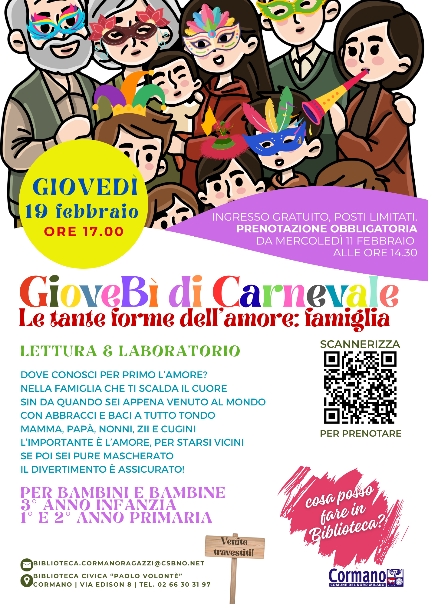Da mercoledì 11 febbraio alle 14.30 ci si può iscrivere al laboratorio creativo che segue la lettura qui: https://bit.ly/CormanoEventiBambini_Ragazzi oppure al telefono 02 66303197