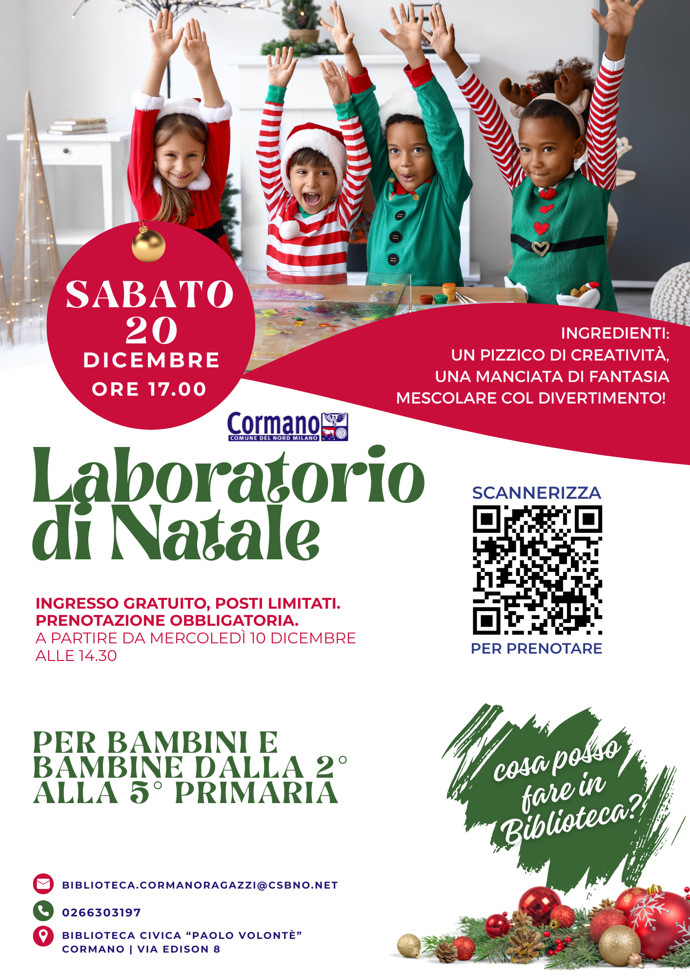 L'evento è gratuito ma con obbligo di prenotazione da mercoledì 10 dicembre alle 14.30 tramite il link apposito che trovate qui: https://bit.ly/CormanoRagazzi oppure via telefono allo 0266303197.